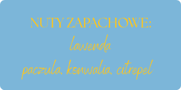 Paczula, konwalia oraz lawenda tworzą przepiękną kompozycję. Natomiast dodatek citrepelu, nie tylko odstrasza komary, ale również dodaje całości lekkiego, świeżego, cytrusowego aromatu!